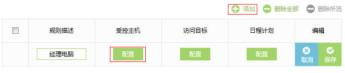 步骤二:设置经理上网规则 1、新建规则 在设置界面点击 添加,添加经理电脑的访问权限。点击受控主机栏的 配置,如下图: