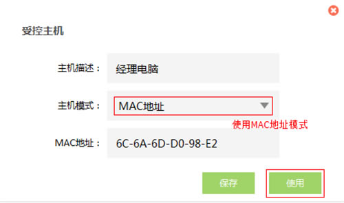 2、添加受控主机 添加经理电脑的MAC地址(也可以控制经理电脑的IP地址),如下图: