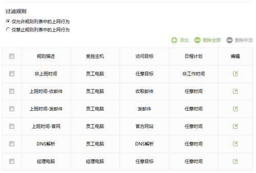 步骤四:启用上网控制功能 过滤规则选择 仅允许规则列表中的上网行为(表中的规则允许,其他不符合规则的均不允许通过),如下图: