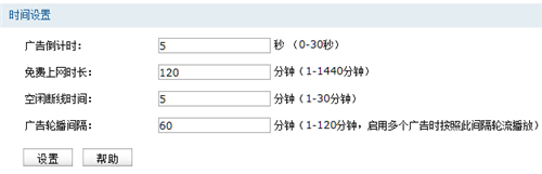 广告倒计时:广告页面停留时间,如果您的广告页面内容比较丰富,可以停留更长时间。 免费上网时间:观看一次广告后可以持续的上网时间,超过该时间限制后页面会再次弹出广告。 空闲断线时间:如果用户再该时间内没有上网,路由器将断开此用户的连接。 广告轮播间隔:添加多页广告时,不同广告循环播放的时间间隔,比如此时为第一条,60分钟后后弹出的是第二条,依次循环切换。 5、体验广告效果:使用无线终端连接广告无线网络的无线信号,无线连接成功后就会自动弹出广告。广告倒计时结束后会出现点击上网按钮,如下图。