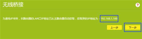 6、记录前端主路由器分配的IP地址,主路由器会给副路由器分配一个IP地址,用于后续管理路由器,建议记下该IP地址。点击“下一步”: