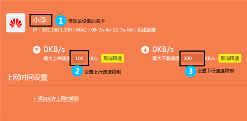 3、限制对应主机的速率,点击终端名字,修改为常用名便于管理。然后点击 限速,分别限制上下行速率的最大值。