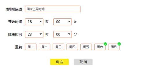 4、添加允许上网的时间段,以本例为准,添加周内和周末两个上网时间段。如下: