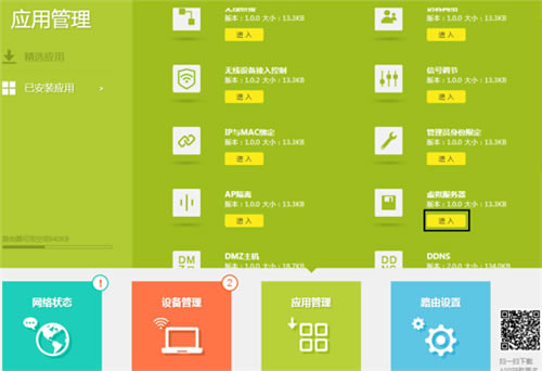 1、在浏览器输入tplogin.cn登录路由器管理界面,点击 应用管理,进入 虚拟服务器,如下图: ![]() 2、点击添加。 ![]() 3、添加映射参数,输入需要映射的服务器的参数,点击保存,如下: ![]() 4、外部端口:外部端口为对外开放端口,即Internet访问服务器使用的端口。添加之后列表如下: ![]() 至此,虚拟服务器规则设置完成。 5、登录DDNS,如果您的宽带并非静态IP地址,可以在 应用管理 >> DDNS 中申请域名并在路由器中登录,登录后使用您的域名和开放的端口访问服务器。进入DDNS设置界面,服务提供者 选择 TP-LINK,登录TP-LINK ID,创建TP-LINK域名,并登录成功,如下图: ![]() 6、根据以上设置,Internet用户通过浏览器访问网页服务器,访问形式为:域名:外部端口,如下图: ![]() 温馨提示:具体的访问形式以实际服务器要求为准。 TP-LINK无线路由采用UFO幽浮外观,造型时尚;信号灵敏、界面友好、功能强大、安全放心。它性价比很高,适合家庭、学生、商务人士使用。 |