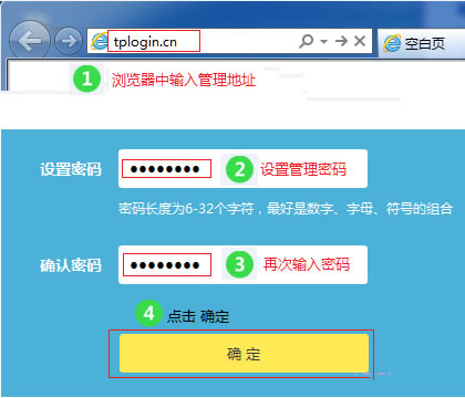 3、在浏览器的地址栏中输入:tplogin.cn,然后按下回车键,在“设置密码”框中设置管理密码——>并在“确认密码”中再次输入——>点击 确定。