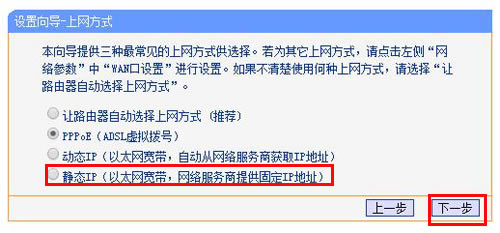 (3)、静态IP:办理了“静态IP”上网宽带业务的用户,宽带运营商会提供一个IP地址、子网掩码、网关、2个DNS服务器地址给用户;在未使用路由器时,需要在电脑本地连接中,填写宽带运营商提供的IP地址、子网掩码、网关和DNS。静态IP上网设置:选择“静态IP(以太网宽带,网络服务商提供固定IP地址)”——>点击“下一步”。
