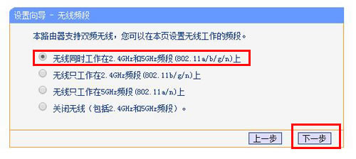 7、选择无线工作频段:建议选择“无线同时工作在2.4GHz和5GHz频段(802.11a/b/g/n/ac)上”——>点击“下一步”。