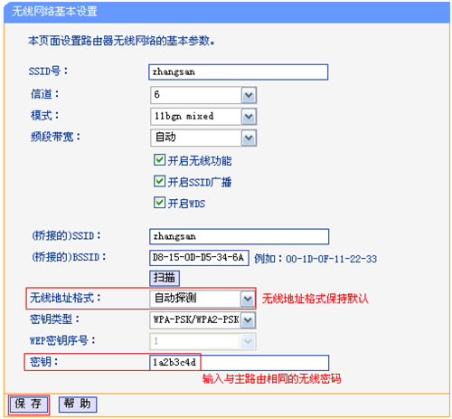 温馨提示:如果在扫描结果中未找到主路由器A的信号,请把主路由器A与副路由器B放得近一些。 4、“密钥类型”选择:WPA-PSK/WPA2-PSK(与主路由器A的密钥类型相同)——>“密钥”输入:1a2b3c4d(与主路由器A的密钥一致)——>点击“保存”。