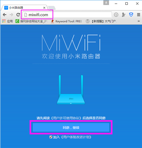 3、设置小米路由器mini ①在浏览器中输入:miwifi.com或者192.168.31.1 并按下回车按键——>然后点击“同意、继续”。