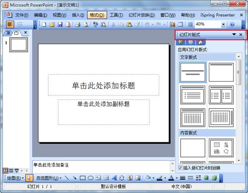 注意查看上面图片中,“幻灯片版式”右侧有一个向下的“小箭头”,点一下打开它,从中选择“幻灯片设计”选项。出现如下图所示。